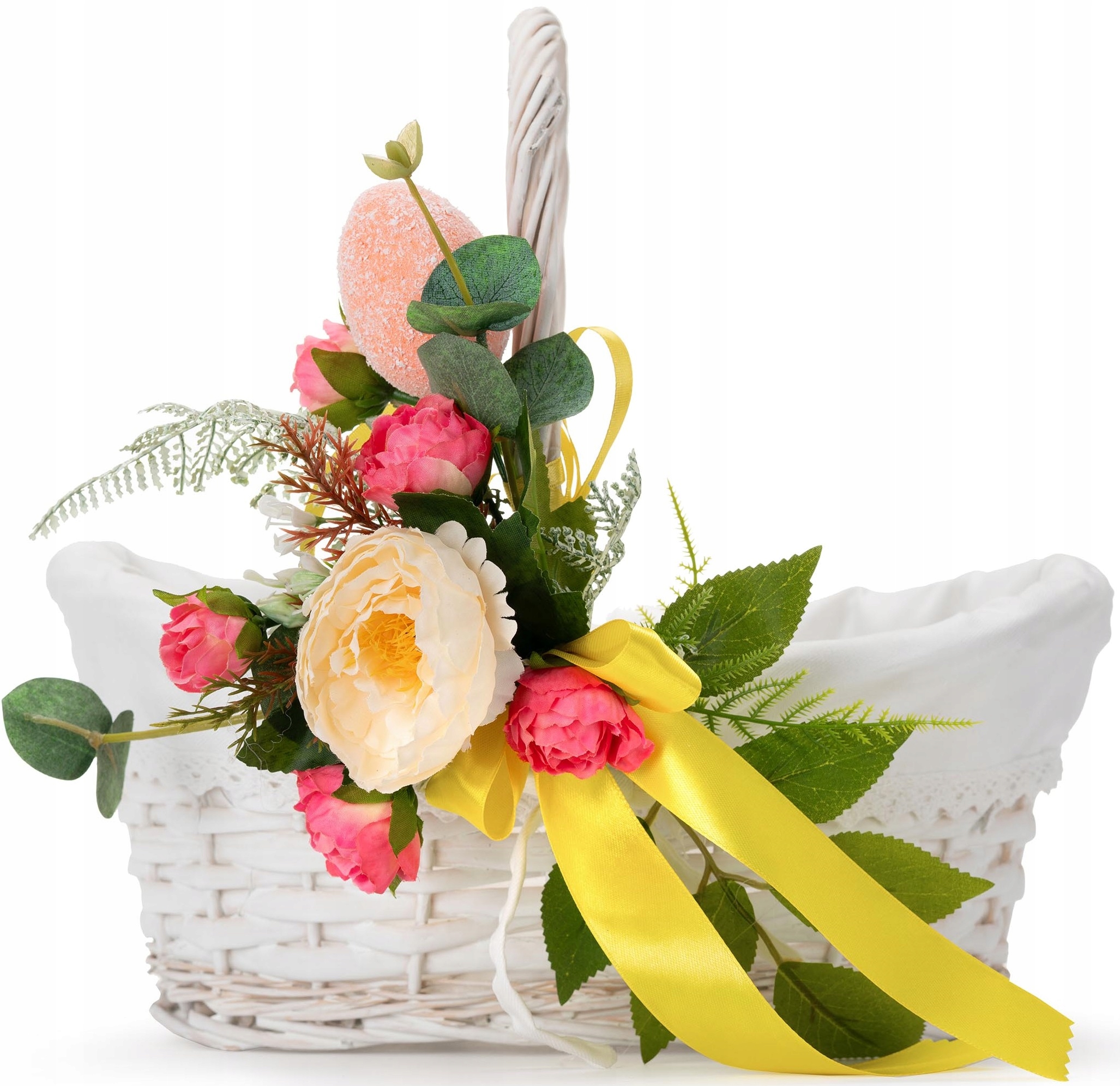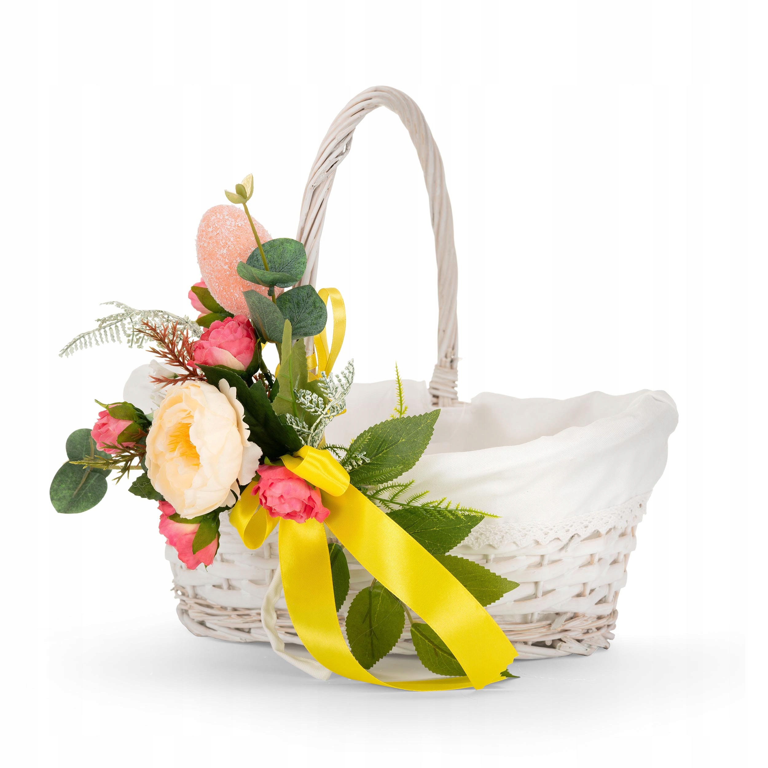 Piękny, pleciony, biały ręcznie wykonany koszyk wielkanocny wraz z piękną dekoracją kwiatową.